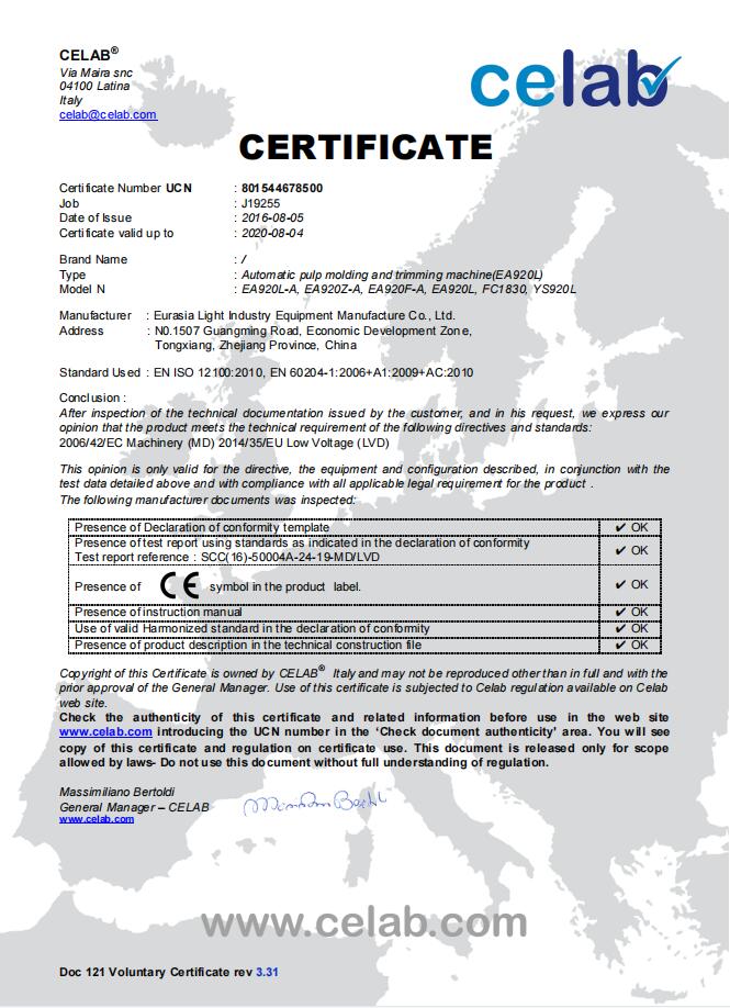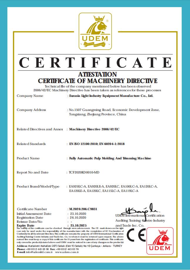 歐亞公司EAMC公司一直致力于紙漿模塑的生產(chǎn)工藝研究、紙漿模塑制品的設(shè)計開發(fā)、紙漿模塑制品模具的設(shè)計開發(fā)、紙漿模塑設(shè)備生產(chǎn)線的研究開發(fā)等全方位研究工作。成功研發(fā)出一機多用的高效全自動紙漿模塑設(shè)備生產(chǎn)線。它集“成型、定型、切邊、側(cè)沖孔”等功能于一體。歐亞公司研發(fā)的一次成型的“帶倒扣可降解紙模杯蓋”全自動生產(chǎn)線,更具領(lǐng)先性和競爭力。